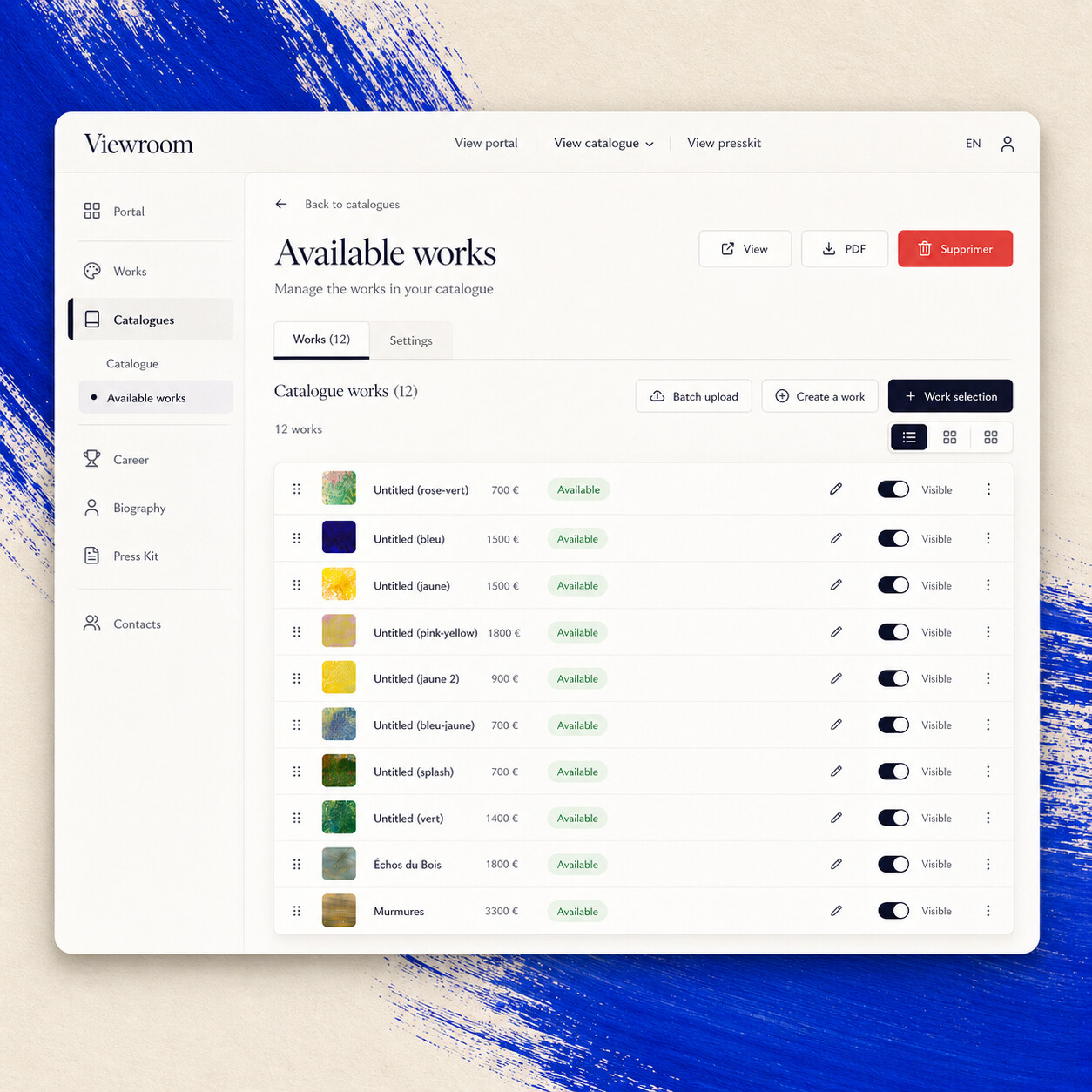 Create as many catalogues as you want. Edit them in a few clicks. Manage your works and their stories over time — your archive too.