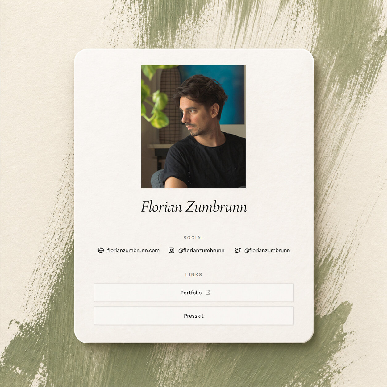 One link. Catalogue, bio, journey, press kit — all under the same address. In place of Linktree, Cargo.site, or a website you never update.