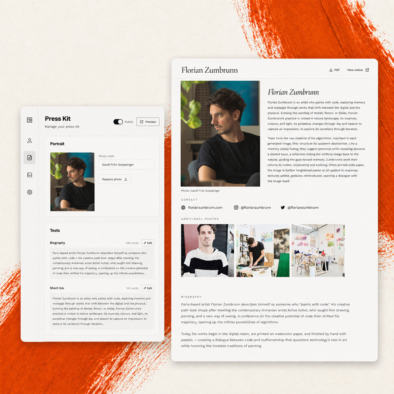 Direct access to your high-res photos, biography, journey, exhibitions. Everything a gallerist or journalist comes looking for — one URL to send.